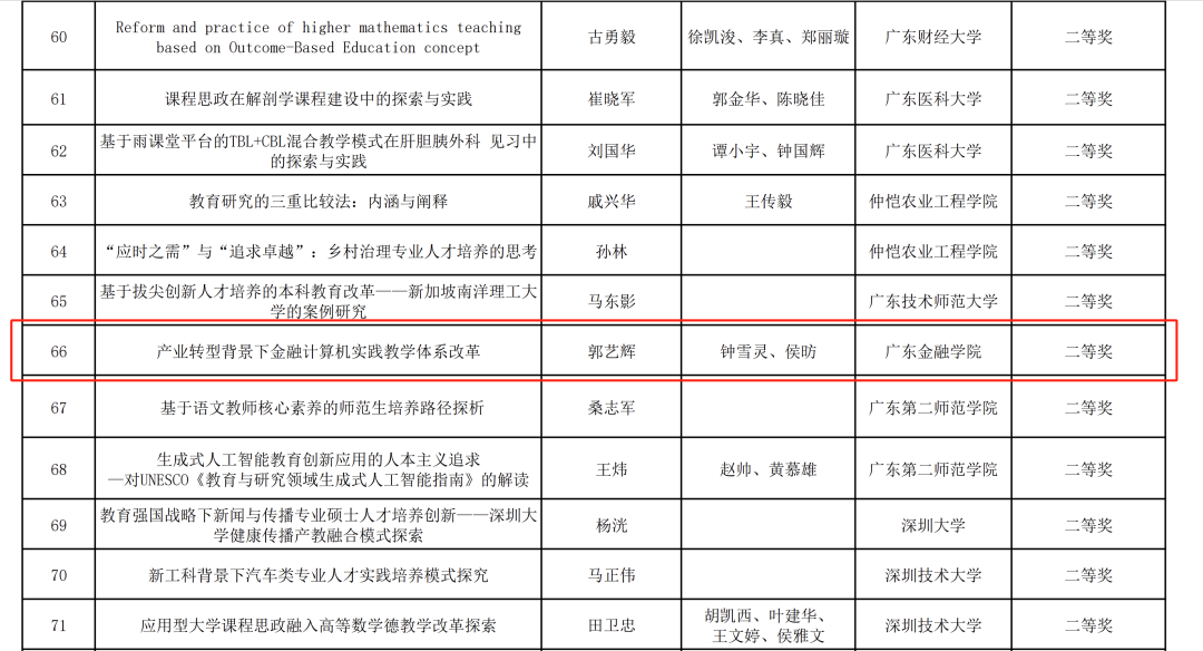 近日,广东省高等教育学会公布了第三届高等教育研究优秀成果奖获奖名单。此次评奖一等奖不超过参评成果的10%,二等奖不超过15%,三等奖不超过25%。Beat365官网郭艺辉、钟雪灵、侯昉三位老师合作的论文《产业转型背景下金融计算机实践教学体系改革》获评第三届高等教育研究优秀成果奖二等奖一项。