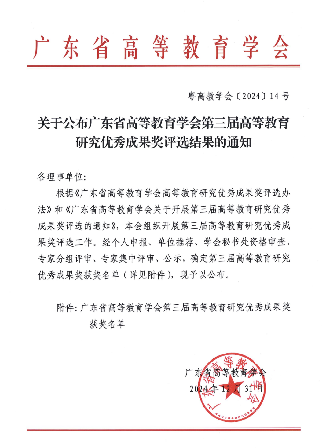 本次高等教育研究优秀成果奖旨在繁荣发展广东省高等教育研究,激发高等教育工作者推进高等教育理论与实践研究的积极性、主动性和创造性,提升高等教育研究质量和水平。本次获奖是Beat365官网长期以来一直鼓励和重视广大教师和科研人员勇于创新、产出高水平科研成果的结果。成果为其他高校提供了可借鉴的优秀范例。