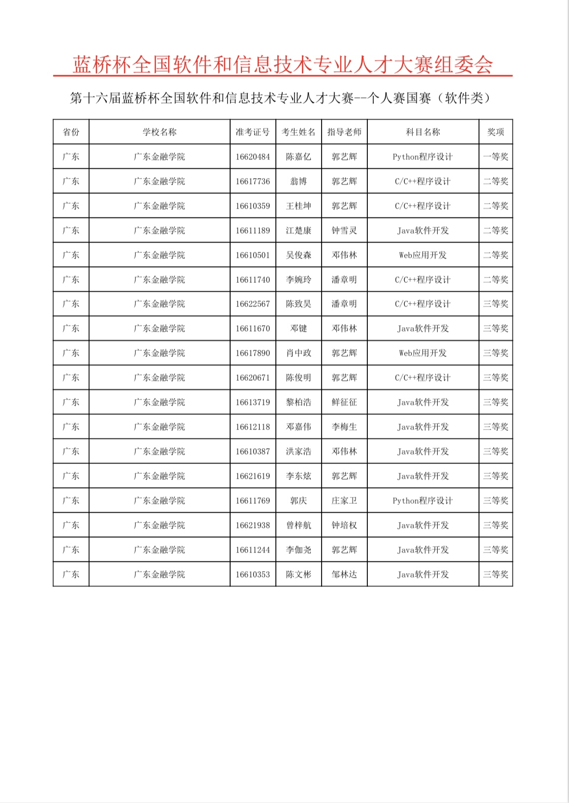 经过激烈角逐,陈嘉亿同学获Python程序设计大学B组全国一等奖,翁博等5名同学获软件类大学B组全国二等奖,陈致昊等13名同学获软件类大学B组全国三等奖,蔡奇欣等9名同学获软件类大学B组全国优秀奖。