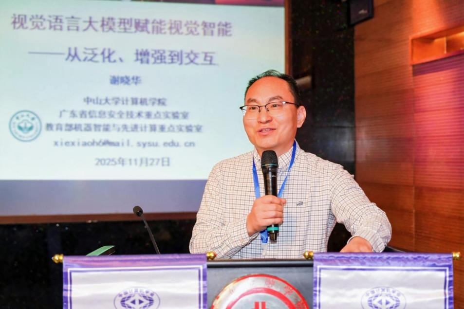 中山大学谢晓华教授在报告中系统阐述了计算机视觉技术的范式转变。他指出,以深度学习为代表的传统方法在封闭世界假设下已趋成熟,但其泛化能力弱、依赖标注数据等局限在开放环境中日益凸显。视觉语言大模型的兴起,带来了开放词汇视觉识别这一核心突破,使模型能够理解并识别训练集中从未见过的类别。针对资源有限的科研团队,谢教授分享了基于CLIP模型的提示学习、适配器技术及插件式增强等高效调优路径,实现了大模型能力的高效迁移。他展望未来,视觉智能的突破将依赖于传统CNN与Transformer架构的深度结合,以及多模态信息的有效对齐。