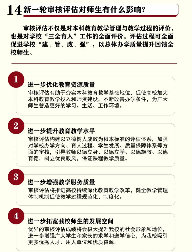 2021年1月21日,教育部印发《普通高等学校本科教育教学审核评估实施方案(2021-2025年)》,正式启动普通高等学校本科教育教学审核评估(以下简称“新一轮审核评估”)。新一轮审核评估既是对学校办学方向与本科地位、培养过程、教学资源与利用、教师队伍、学生发展、质量保障及教学成效等方面的综合检验,也是学校总结办学经验开创发展新局面的机遇,更关系到每一位师生员工的切身利益。把握新一轮审核评估的契机,推进学校内涵式高质量发展,是全校师生员工的共同责任、共同愿望和共同方向。